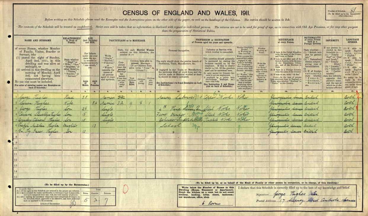 George, now 55, is a Mason's Labourer. Susan is 54. Their children are George, 28, a 4th Hand Sieming Funter; Edward Llewellyn, 18, who is Fero Dumper; Brynley Clement, 15, who is Behinder Tinplate Works; Evelyn Matilda, 13; and William Henry Fraser, 10, who both go to school.