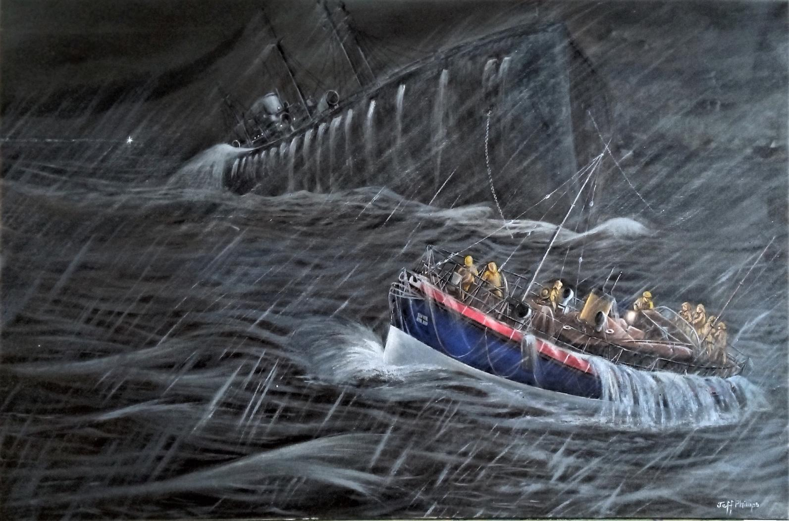 The crew was Coxswain William John Gammon, holder of the RNLI’s highest award – a Gold Medal for leading the rescue of 42 officers and crew from a torpedo-damaged Canadian frigate caught in a storm off Port Talbot in October 1944 – chose his crew carefully. When the lifeboat, Edward, Prince of Wales, launched at 12 minutes past 6 into the gale force wind, driving rain and rough seas her eight-man crew consisted of Coxswain Gammon, Mechanic Davies (RNLI Bronze Medal holder), Second Coxswain William Noel, Assistant Mechanic Ernest Griffin, Bowman William R.S. Thomas, William Ronald Thomas (William Noel’s brother-in-law), Richard Henry Smith (due to be married in three days) and William Howell.